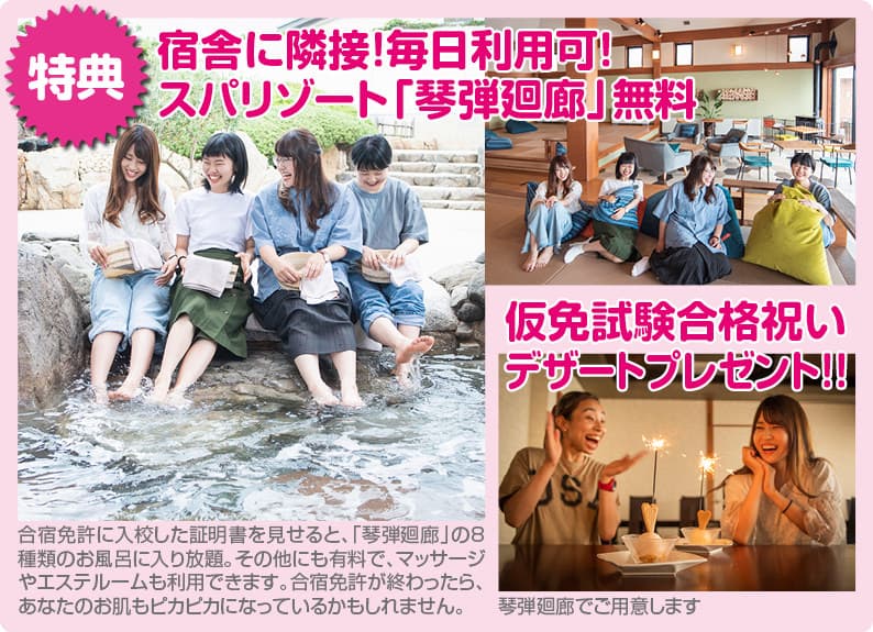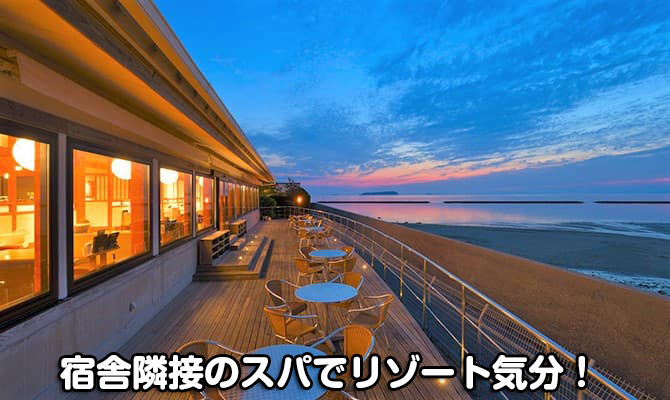 宿泊施設に隣接するスパリゾート「琴弾廻廊」では、日本の夕陽百選に選ばれた有明浜の夕陽を一望できるサウナや、露天風呂や海水の潮風呂、黒御影石でつくられた石風呂など、多種多様な温泉が楽しめる施設。合宿期間中、毎日無料で利用できますので、リゾート気分をたっぷり味わってください!