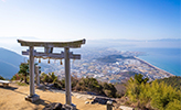 高屋神社の本宮は標高404メートルの稲積山の頂上にあり、「天空の鳥居」として知られています。まるで空に浮かぶような神社から、美しい瀬戸内海と観音寺の街が一望できる絶景スポットです。